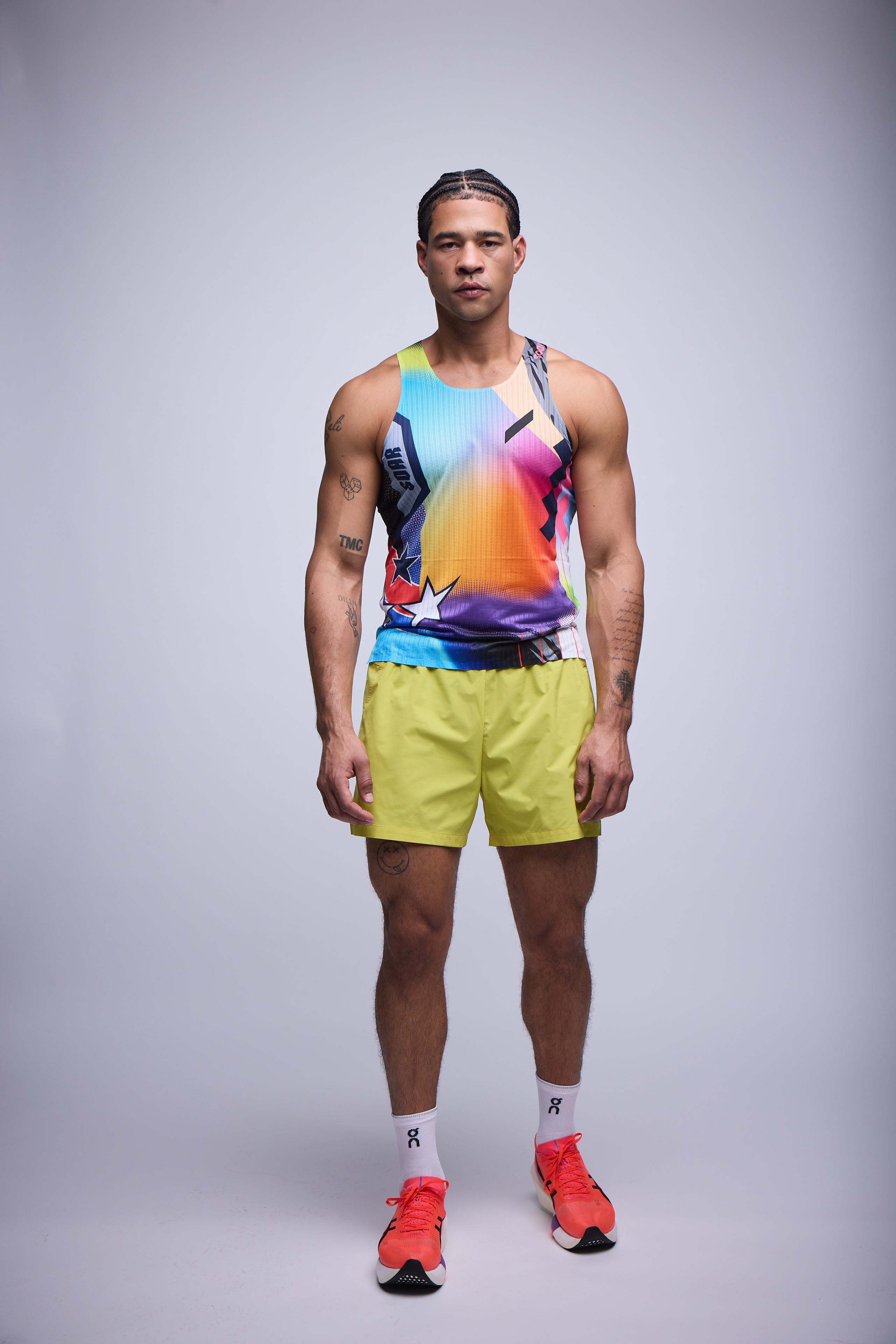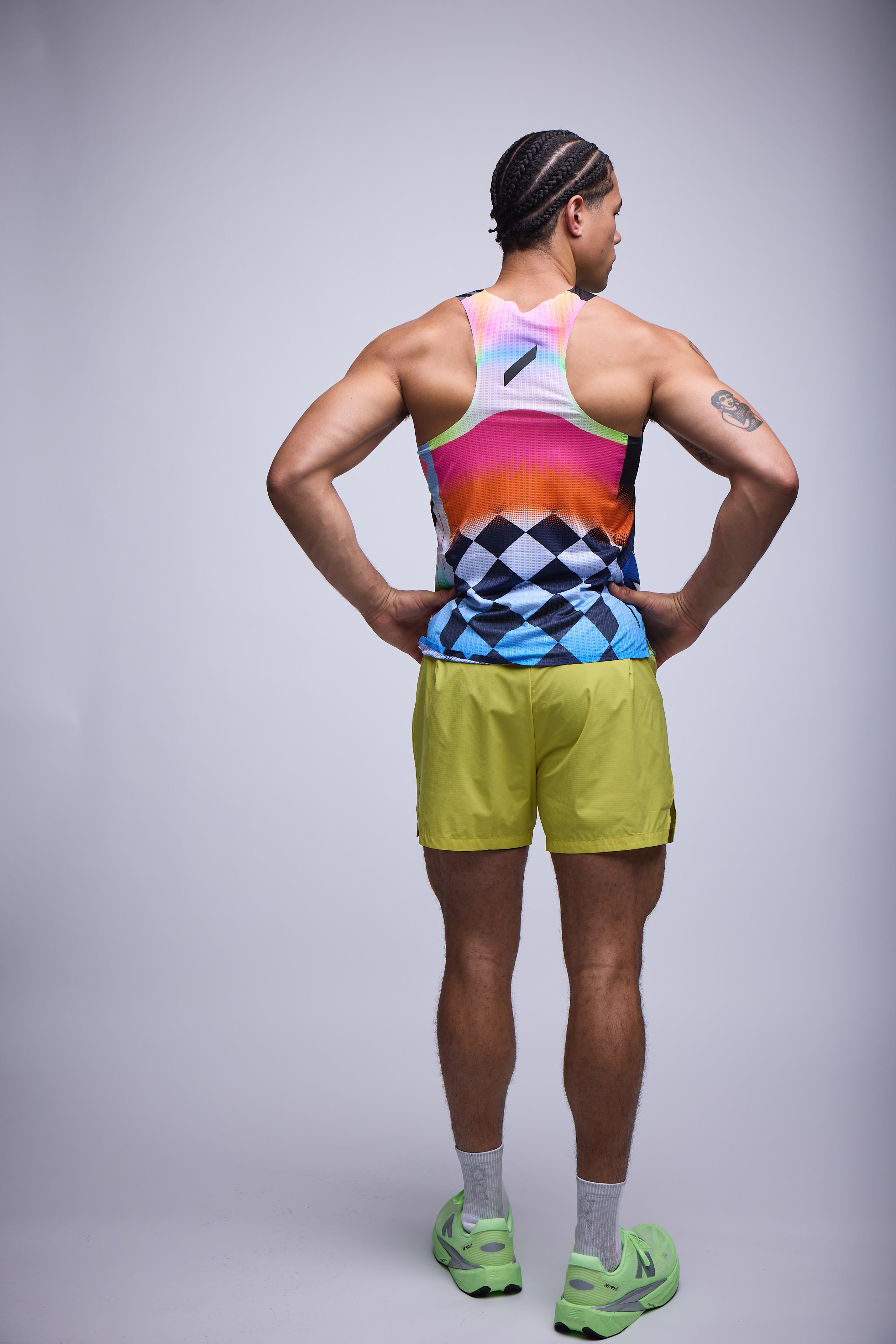 A notched, film-bonded side split boosts mobility without adding weight. Seam placement has been reconsidered, reducing bulk and sharpening the silhouette. Every refinement serves a single goal: race-day speed with a barely-there feel.